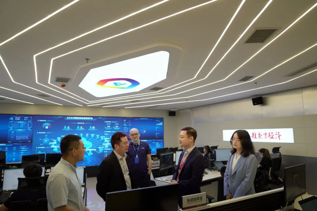 在参观完展厅之后一行人来到安全运营中心进行观摩交流,安全运营中心高级总监季靖汇报了安恒信息西北安全运营中心当前状况,该中心是安恒信息全国布局的一级运营能力中心,具备监测预警、威胁狩猎、威胁情报输出、应急处置等能力,可以有效提升全域网络空间安全治理水平、赋能全国各二三级城市安全运营中心的建设和运营,并同时为信息安全产业发展提供孵化平台和输出产业人才。