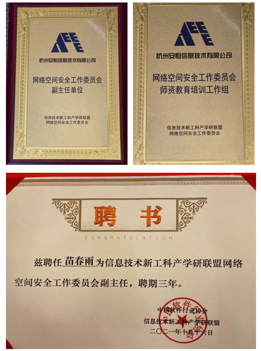 本次大会,安恒信息被授予网安工委会副主任单位,同时牵头“网络空间安全工作委员会师资教育培训工作组”开展工作;安恒信息高级副总裁、数字人才创研院院长苗春雨获聘网安工委会副主任委员。