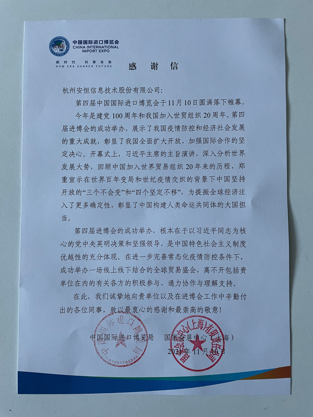 沉甸甸!来自进博会官方的感谢信_2021_安恒动态_关于人生就是搏z6尊龙_安恒信息