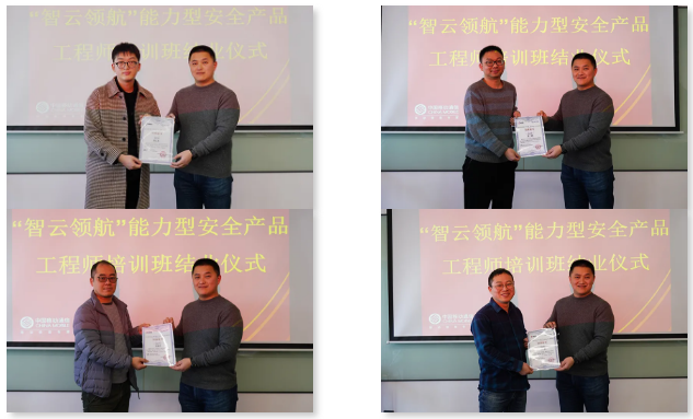全体学员参加并全部通过了本次培训的理论及实操结业考试,获得“智云领航”能力型安全产品工程师认证证书。现场,安恒信息副总裁、网络空间安全学院副院长吴鸣旦为学员颁发证书。