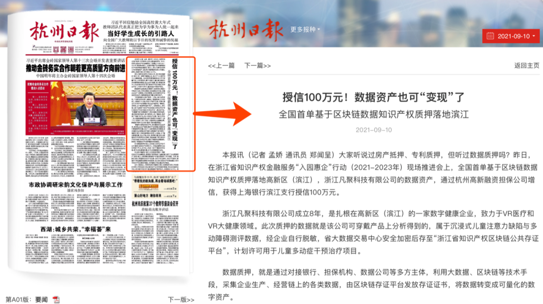 数据资产也能像不动产一样被质押,获得银行授信了。全国首单基于区块链数据知识产权质押落地,获得授信100万元!安恒信息数据安全岛助力企业数据资产“变现”。近日,杭州日报刊登的一篇报道很吸睛——《授信100万元!数据资产也可“变现”了 全国首单基于区块链数据知识产权质押落地滨江》。这篇报道中提及的案例,正是安恒信息数据安全岛案例,让人生就是搏z6尊龙一探究竟。9月9日,在浙江省知识产权金融服务“入园惠企”行动(2021-2023年)现场推进会上,全国首单基于区块链数据知识产权质押落地高新区(滨江),浙江凡聚科技有限公司的数据资产,通过杭州高新融资担保公司增信,获得上海银行滨江支行授信100万元。浙江凡聚科技此次数据质押的是该公司可穿戴产品上分析得到的沉浸式儿童注意力缺陷与多动障碍测评数据,经企业自行脱敏,浙江省大数据交易中心安全加密后存至“浙江省知识产权区块链公共存证平台”,计划许可用于儿童多动症干预治疗项目。数据质押,就是通过对接银行、担保机构、数据公司等多方主体,利用大数据、区块链等技术手段,采集企业生产、经营链上的各类数据,由区块链存证平台发放存证证书,将数据转变成可量化的数字资产。无论企业还是银行,在数据质押决策环节如何保障数据的安全性,都是焦点问题。