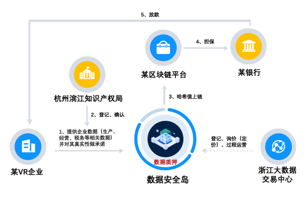 企业将自身核心数据资产质押贷款,数据加密质押在数据安全岛上,安全岛计算数据哈希值并记录在区块链中,作为凭证: