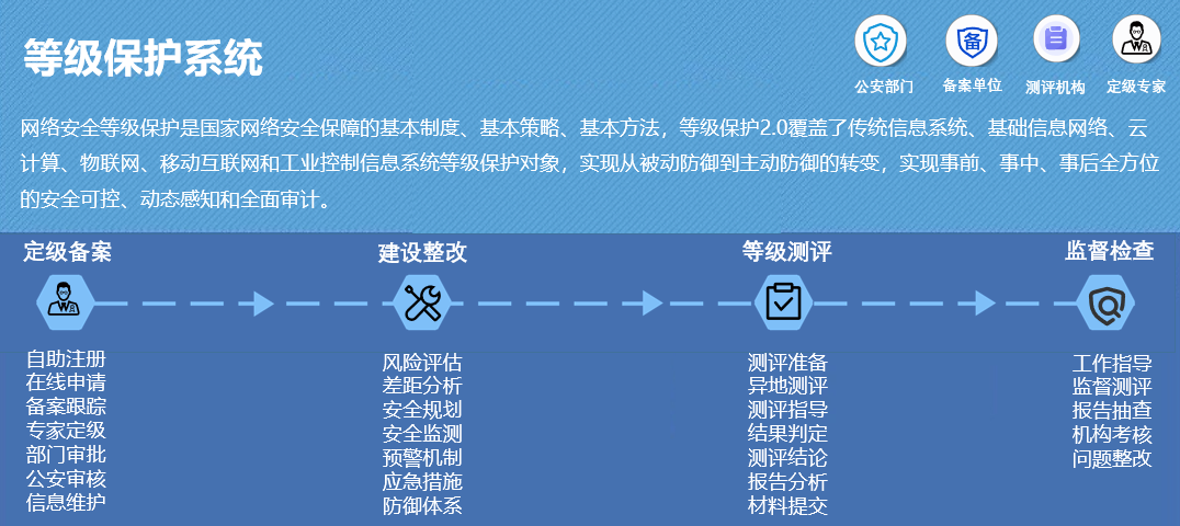 ● 响应:平台提供等级保护管理模块,针对关键信息基础设施运营者开展网络安全等级保护备案工作,提供在线提交备案材料,在线提交测评结果,在线提交备案证明申请、在线变更备案信息及跟踪提醒备案进度等功能;针对测评机构的监管工作,提供与公安网安开展日常业务的渠道,从而实现等级保护业务“最多跑一次”。