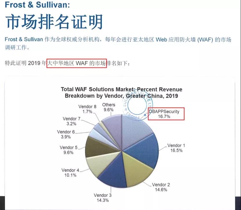 前几日,安恒信息新一代智能WAF斩获了Frost&Sullivan 2019年大中华区(包括但不限于中国大陆+港澳台)Web应用防火墙整体市场份额排名第一的殊荣。