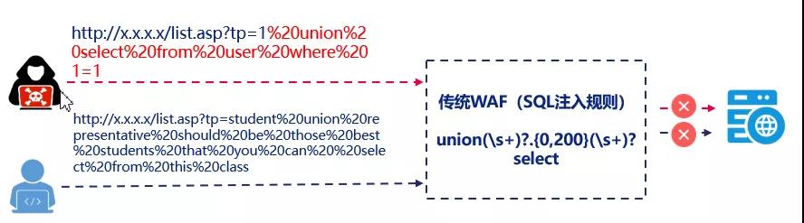 传统基于静态签名规则的WAF应对这种情况就存在两难的问题:要么严格限制,这样就会导致正常用户请求误拦截;要么宽松限制,这样则会导致攻击请求被放过,难以两全。