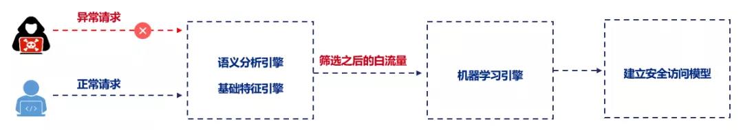 学习阶段:建立模型的流量全部为经过安全检测的白流量,机器学习针对业务系统建立“量身定做”的安全访问模型。