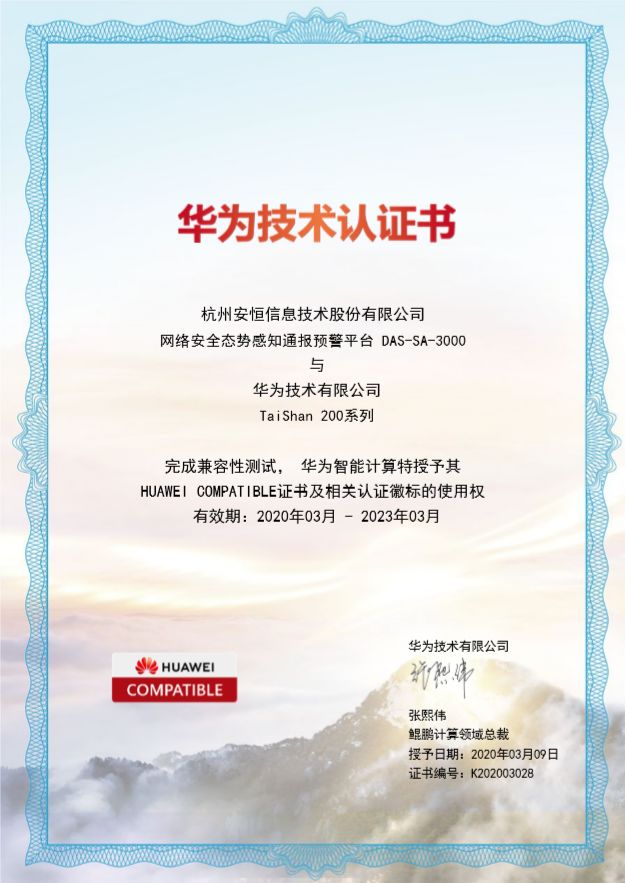 近日,安恒信息网络安全态势感知通报预警平台与华为TaiShan 200系列完成兼容性测试。华为智能计算授予安恒信息HUAWEI COMPATIBLE证书及相关认证徽标使用权。