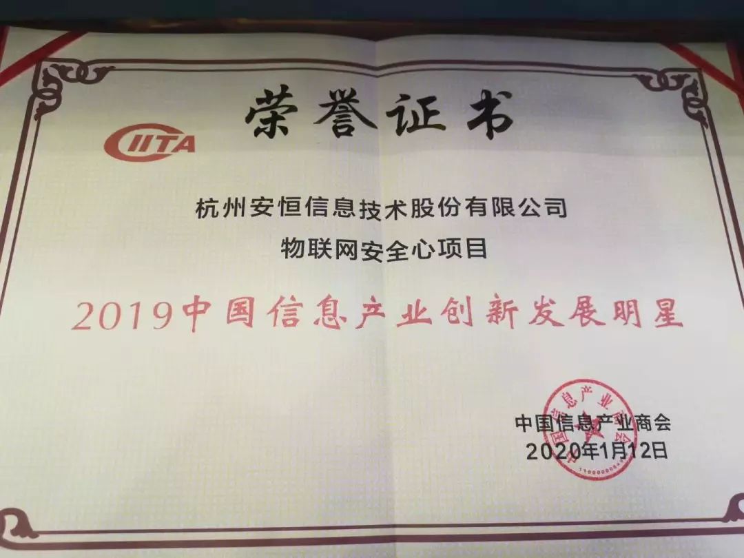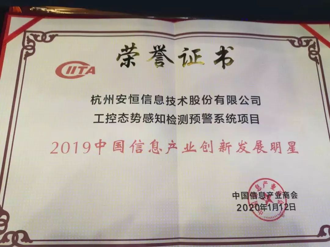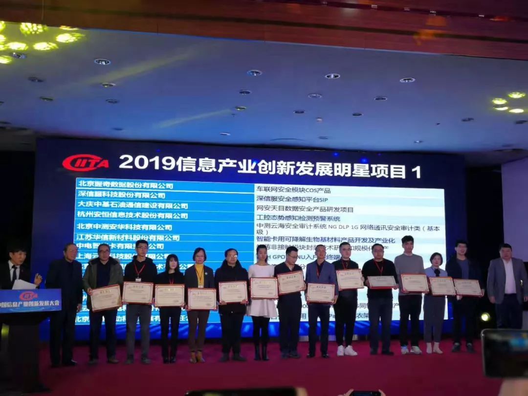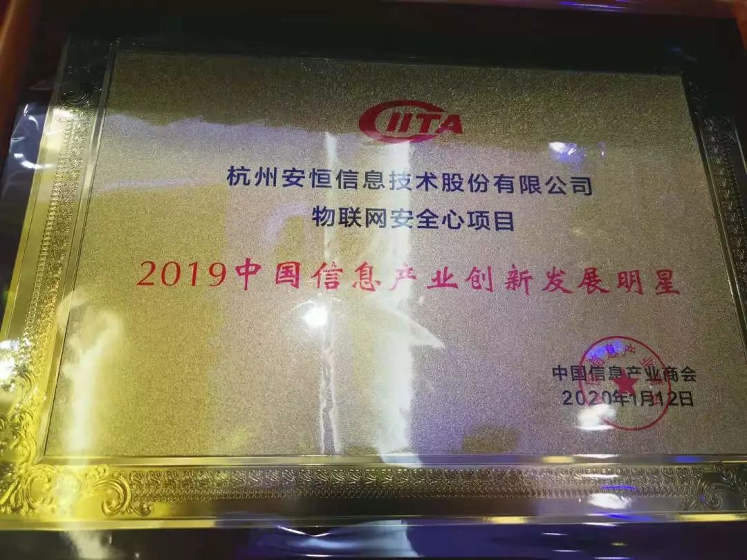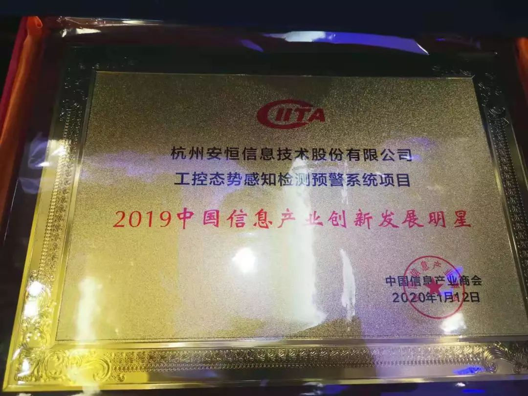 会上,公布了“2019中国信息产业创新发展明星”获奖名单,安恒信息工控态势感知检测预警系统、物联网安全心两个项目获此殊荣。