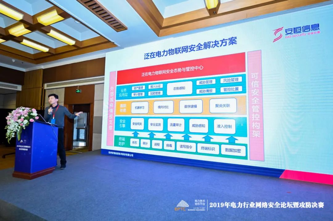 下午的技术论坛上,安恒信息网络安全专家王辉进行了《泛在电力物联网智能防护与可信互联》的演讲。他表示,安恒信息泛在电力物联网终端智能防护与可信互联安全方案采用“云+端”的联动式防护架构,主要依托内核级进程文件防护技术、可信安全管控技术、自适应安全防护技术和区域安全态势分析技术等多项关键技术,对海量物联网终端进行安全监控、传输加密和接入管控,建立物联网终端的区域安全态势分析和威胁感知评估方法,及时对物联网终端进行智能感知、联动处置、主动监测、数据加密、接入管控、身份认证,构建基于智能防护和可信互联的物联网体系架构。