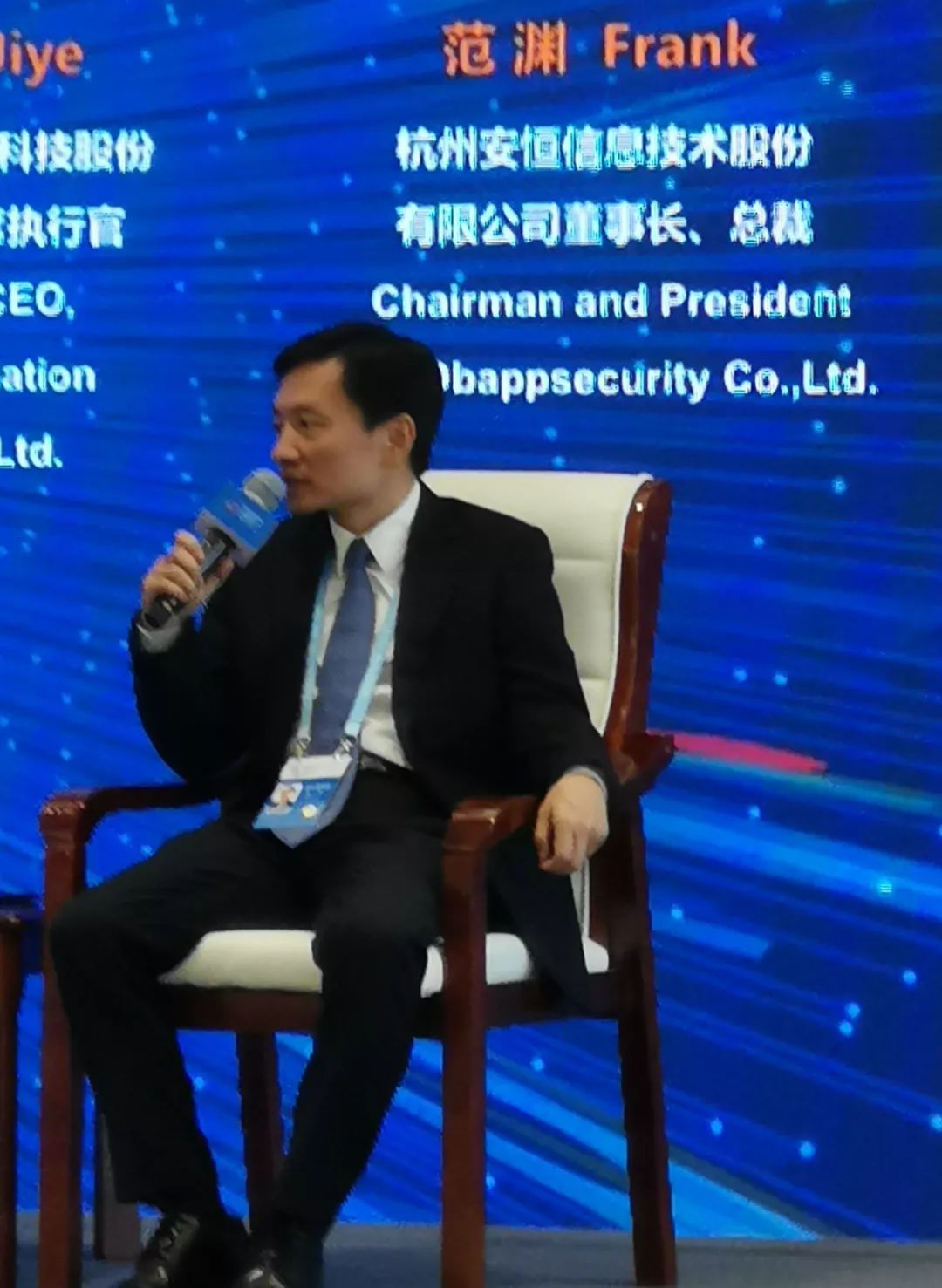 安恒信息董事长范渊受邀参加论坛,并与美国信息产业机构总裁缪万德、西门子(中国)副总裁胡建钧、绿盟科技董事长沈继业、天融信董事长于海波共同参与专题对话讨论。