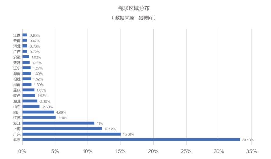 随着网络安全受重视程度日益增高,行业发展也日益增速。中小型企业、私营企业等逐步设立网络安全专岗人员,使得其人才需求量不断增加,特别是以北上广为代表的一线和新一线等省市,人才需求数量占全国需求总量60%以上。这和北上广聚集了大量的网络安全相关的企业和机关有很大的关系。