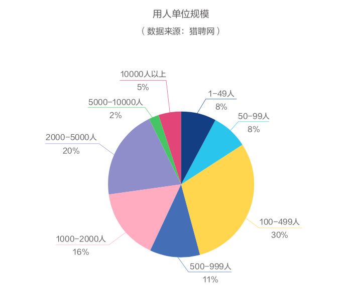 再从用人单位规模来看,大型企业与国家党政机关的相关从业人员较多。但随着2019网络安全等级保护制度2.0标准正式发布,对中小型机构的安全等级要求更高,中小型机构对网络安全人才的需求量普遍较高。其中,规模在100-499人的中小型企业对网络安全人才的需求量最大,占比约30%;其次是2000-5000人的企业,网络安全人才的需求量占比20%。