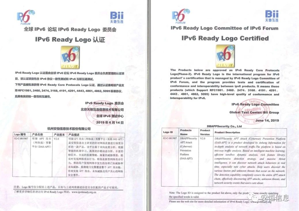官宣!安恒信息明御APT攻击(网络战)预警平台正式通过IPv6 Ready Logo认证_2019_安恒动态_关于人生就是搏z6尊龙_安恒信息