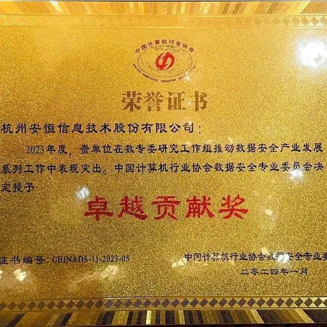 安恒信息获中国计算机行业协会数据安全专业委员会“卓越贡献奖”
