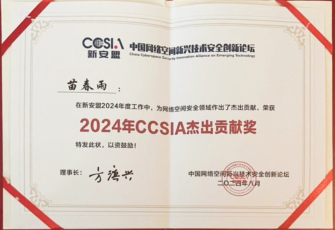 此次荣获2024年CCSIA杰出贡献奖的苗春雨博士,是中国网络空间新兴技术安全创新论坛(新安盟)理事,曾获新安盟推荐荣获2021中国产学研合作促进会“产学研工匠精神奖”;中国网络空间安全人才教育联盟专委、人才标准组副组长;全国信息技术标准化技术委员会教育技术分技术委员会专家;杭州第19届亚运会火炬手,杭州亚运会网络安全保障核心专家。